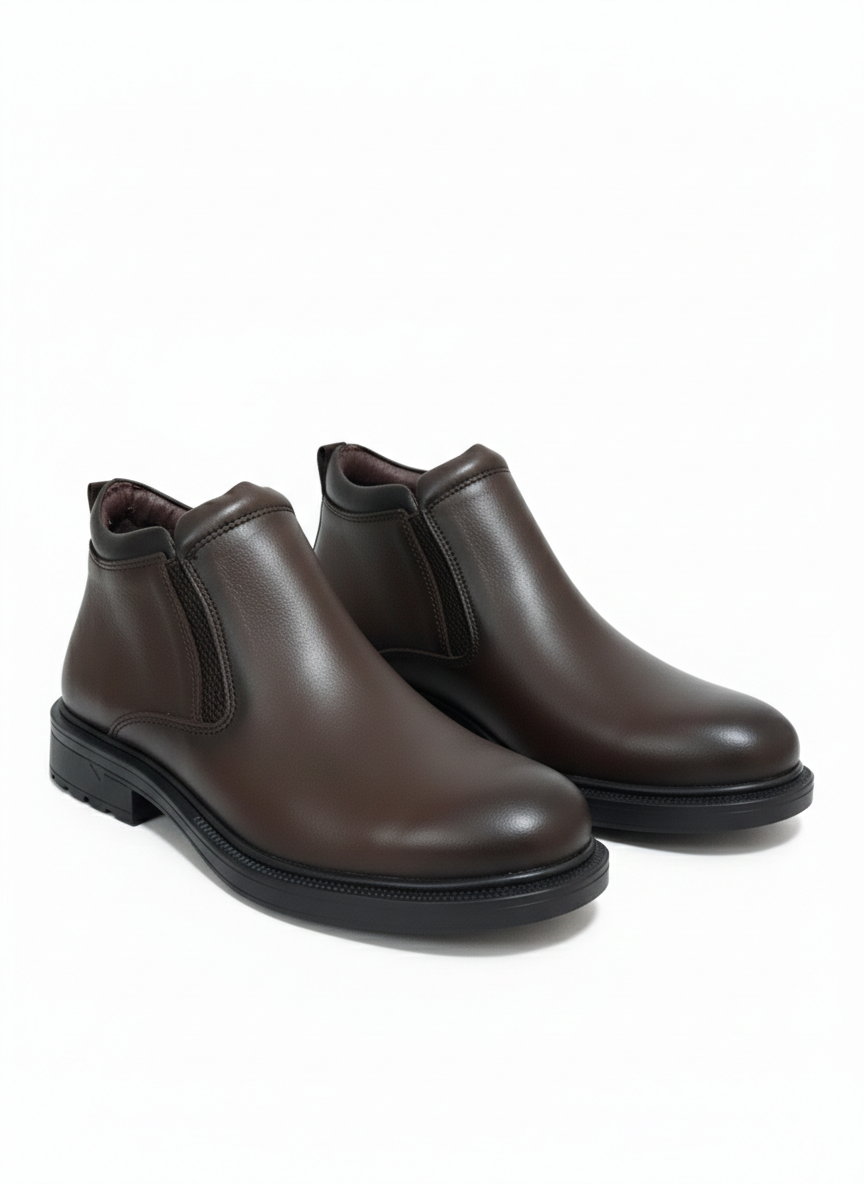أناقة دافئة وعملية في نفس الوقت. هاف بوت مصنوع من الجلد الطبيعي بلون بني راقي بلمسة مطفية ناعمة، تصميمه السهل بدون أربطة يجعله اختيار مثالي للرجل اللي يحب الراحة والستايل الهادئ.